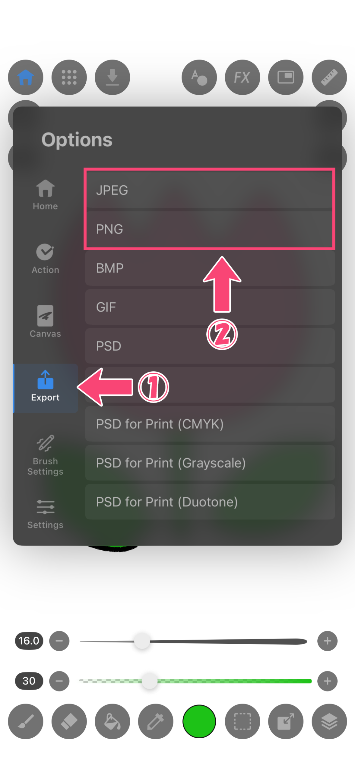 4.Select ① “Export”, then ② “JPEG or PNG”.