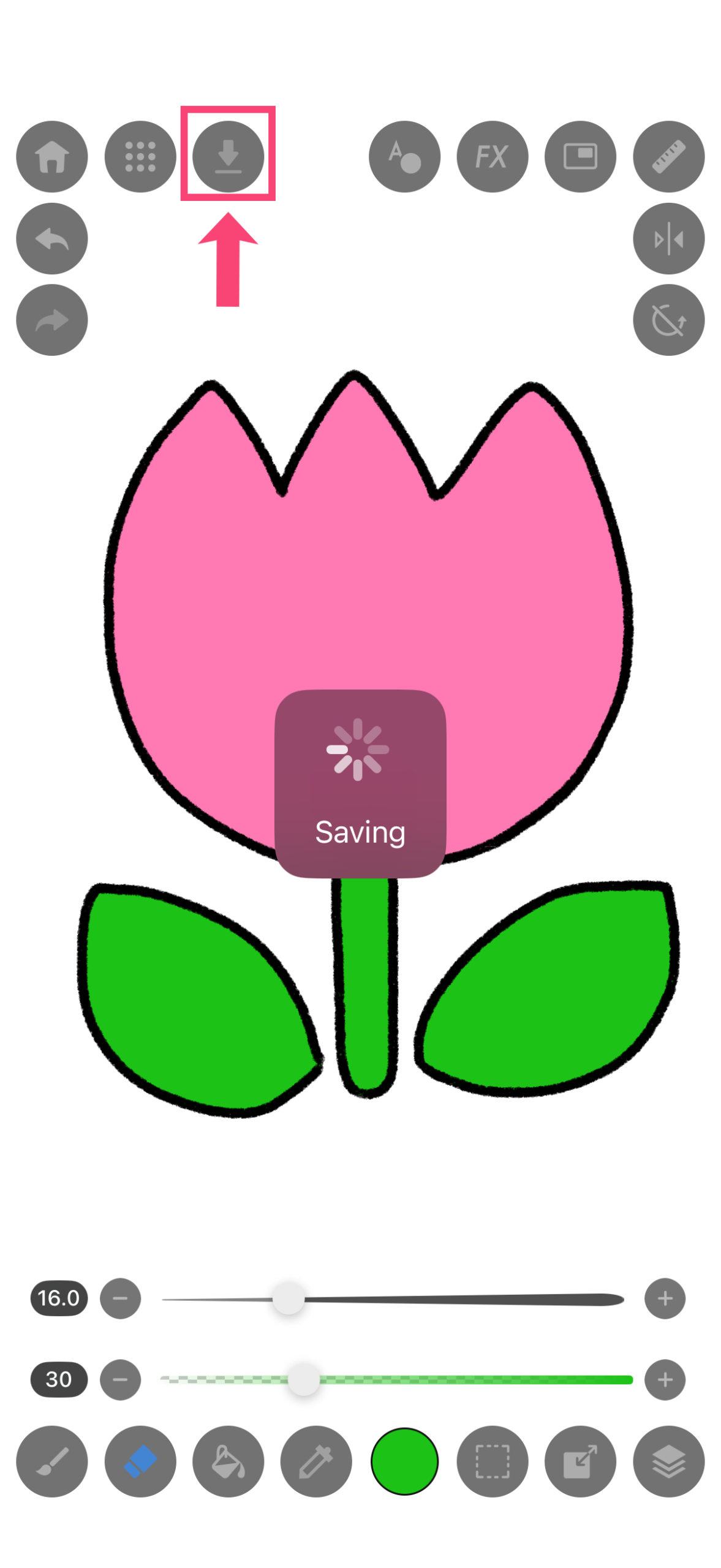 1.Once your artwork is complete, save it first! Tap the “Down Arrow icon” to save it to the app.