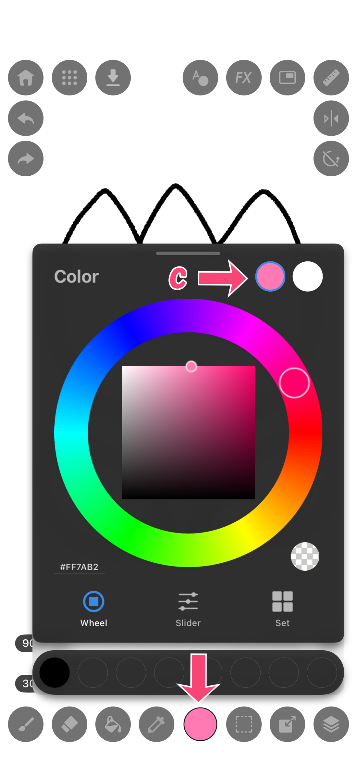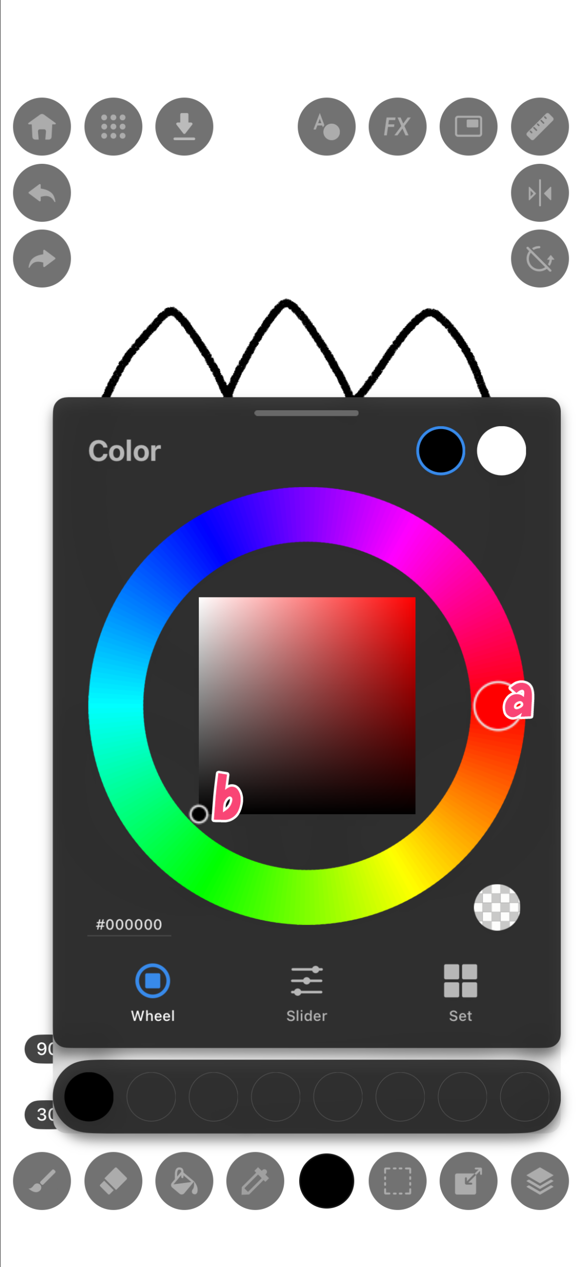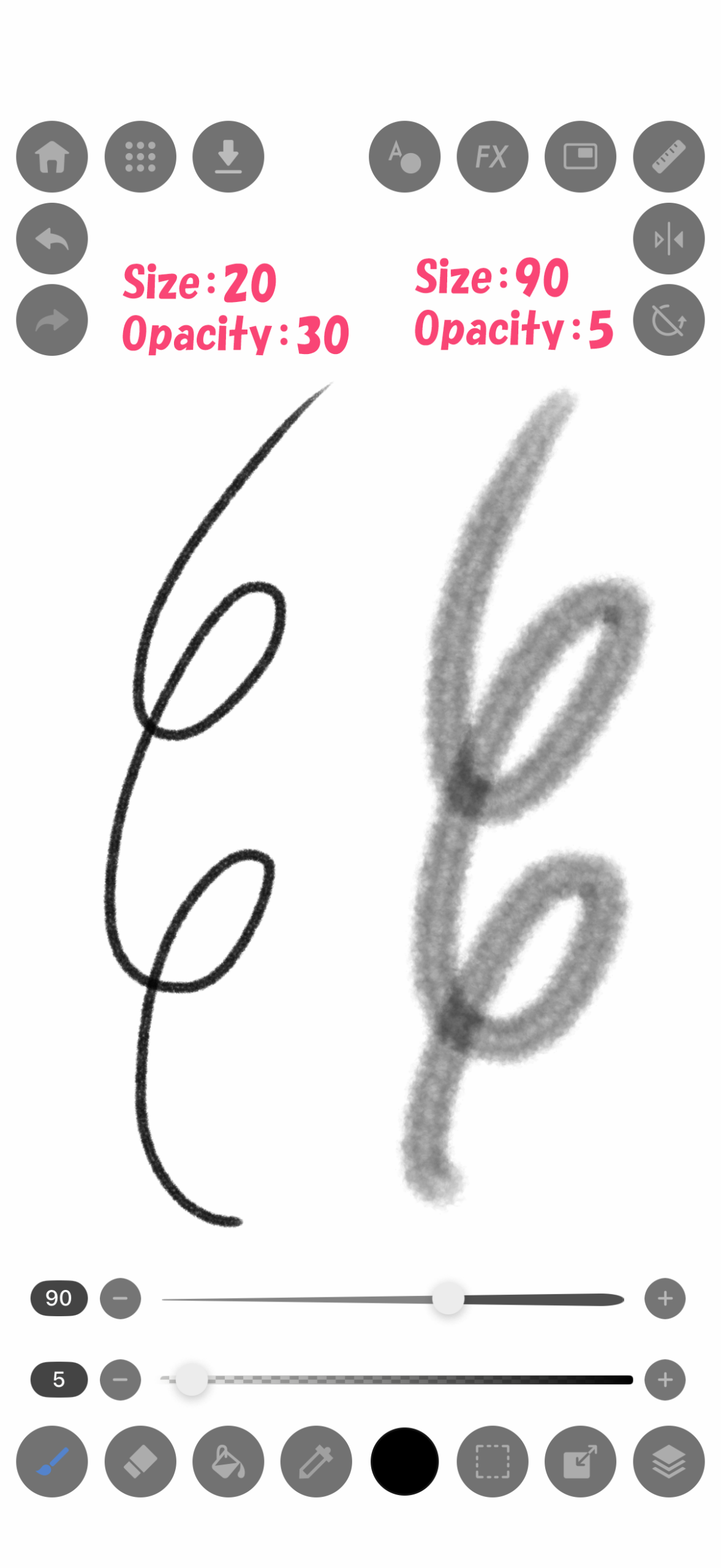 Adjusting Size & Opacity: You can freely adjust the brush size (a) and opacity (b) using the bars at the bottom of the screen.
