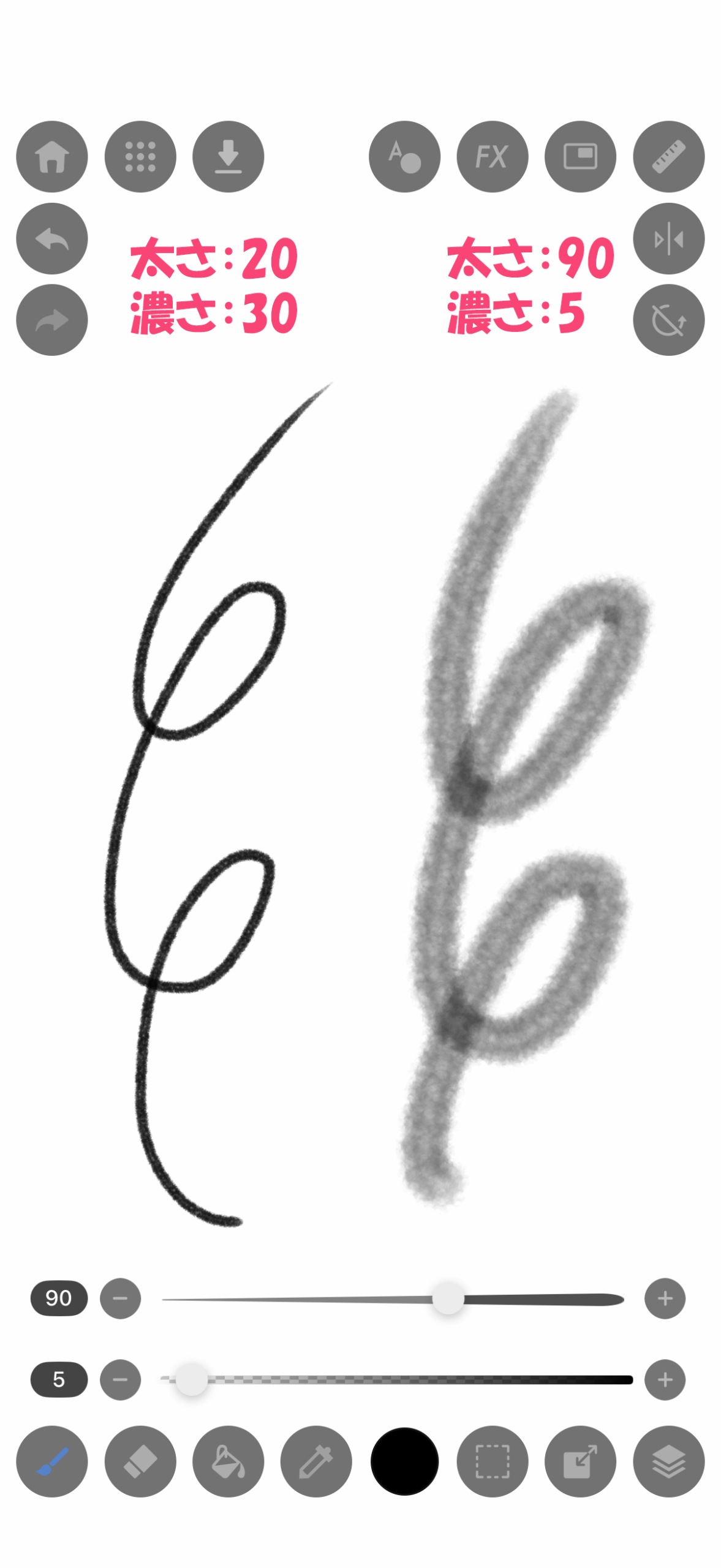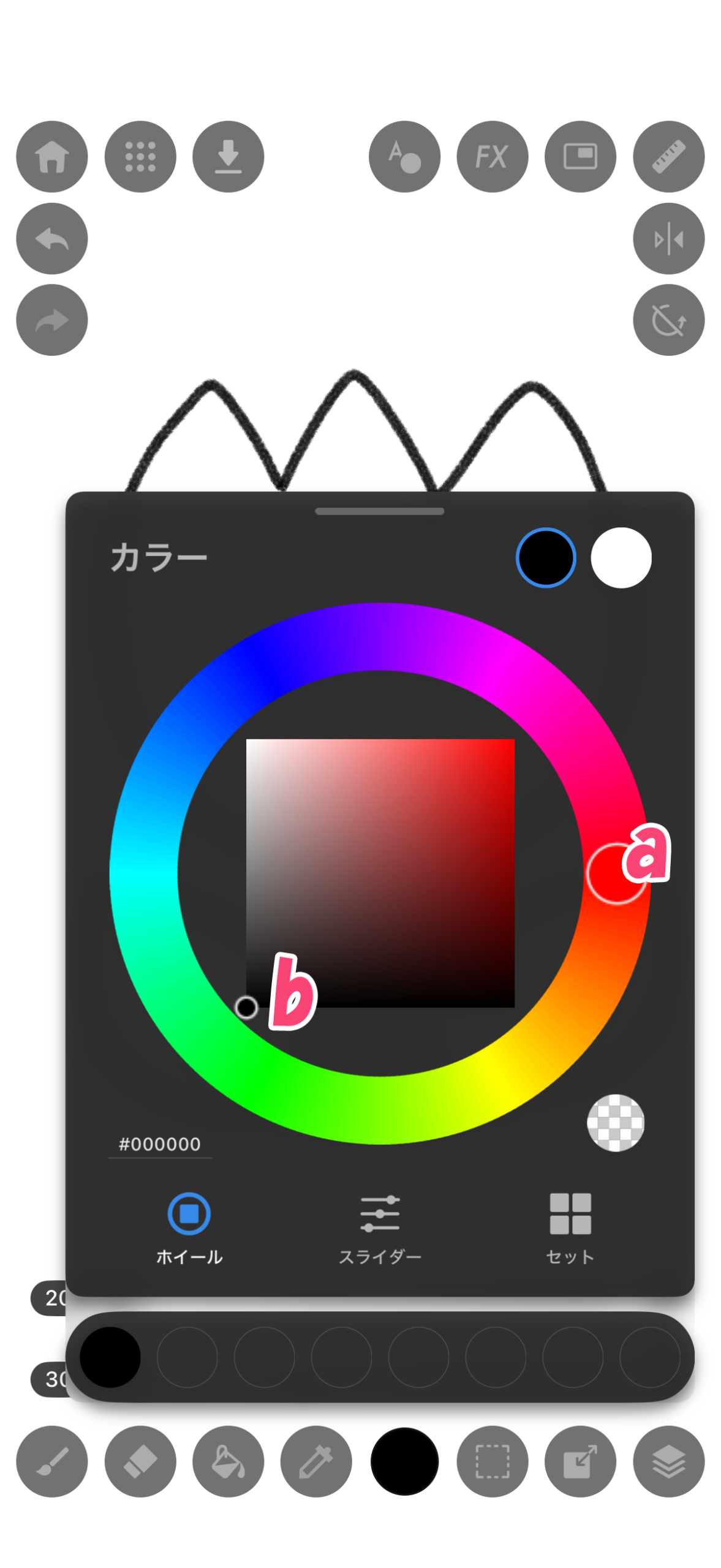太さ・濃さの調整:画面下のバーで、ブラシの太さ(a)や濃さ(b)を自由に変えられます。