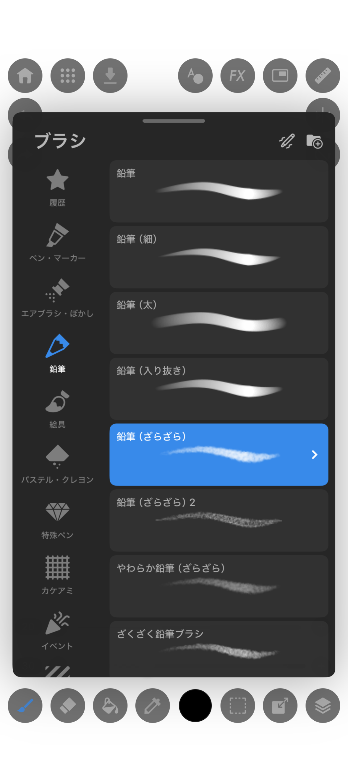 2.はじめは「鉛筆(ざらざら)」が選択されています。スクロールして、好きなブラシを選択してみましょう。