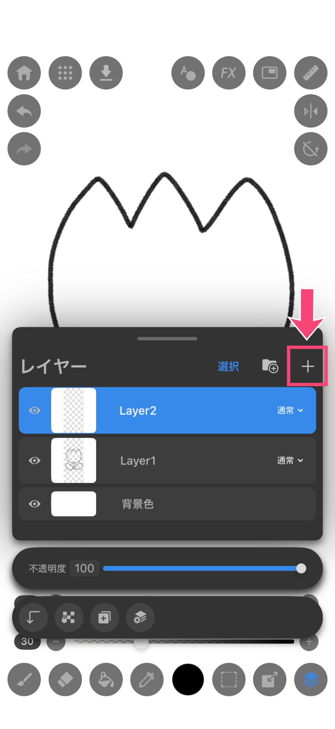 4.追加したレイヤー(Layer2)を長押しして、線画レイヤー(Layer1)の下に移動させます。