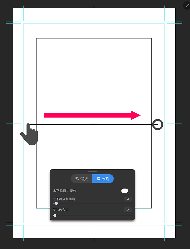コマが作成されたら「分割」タブをタップし、枠の上を切るようにタップ&スライドします。