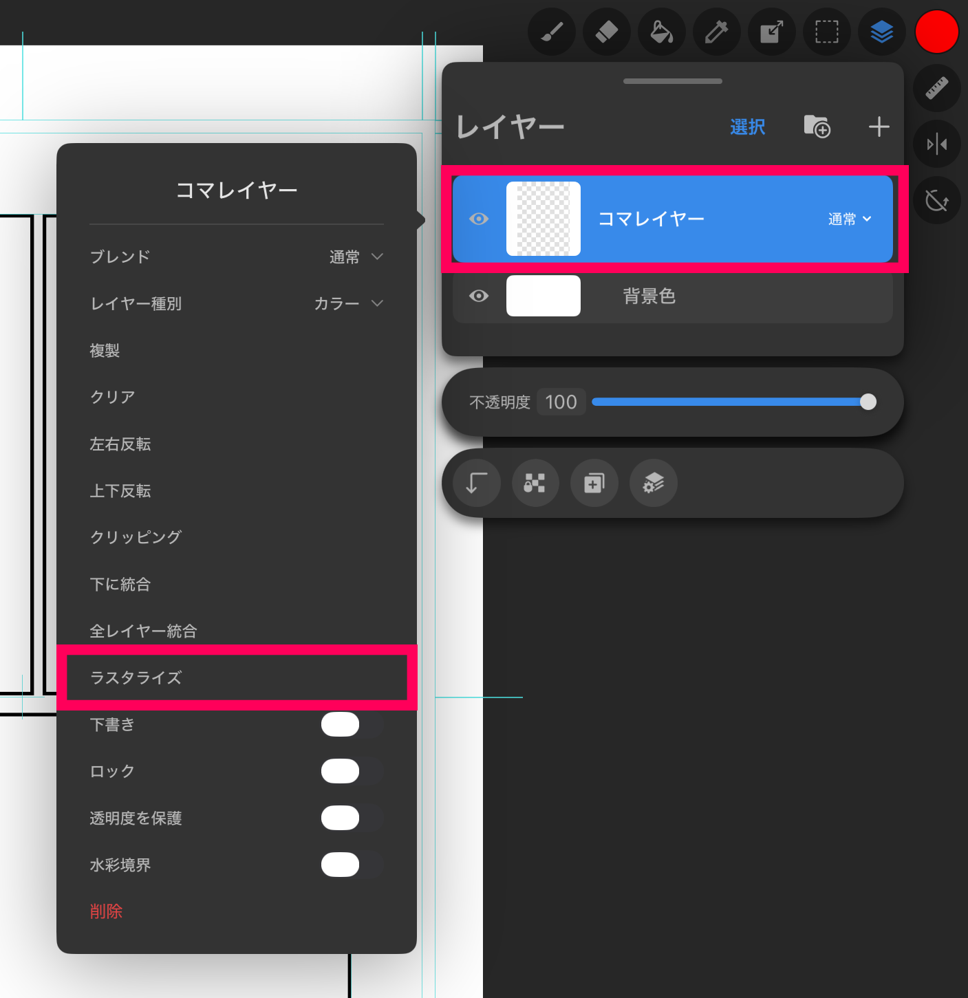 コマを部分的に消しゴムで消したい場合は、コマのレイヤーを「ラスタライズ」する必要があります。