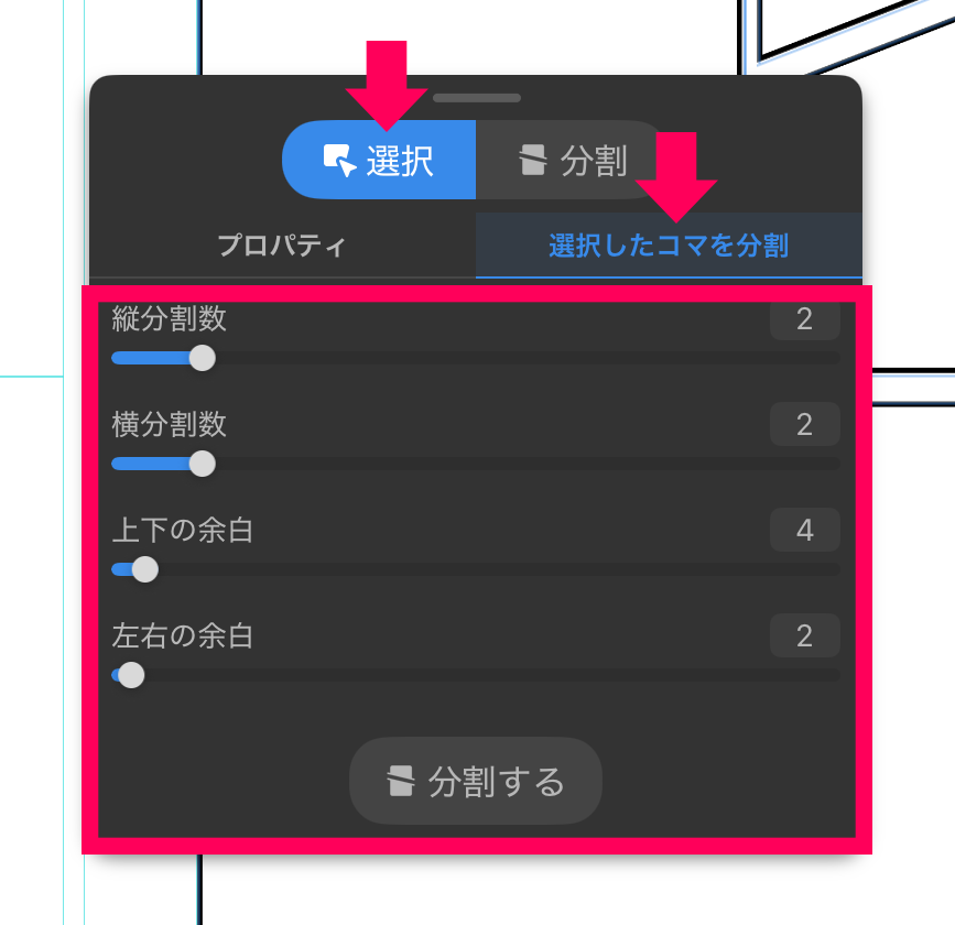 「選択したコマを分割」タブでは選択したコマの追加分割ができます。