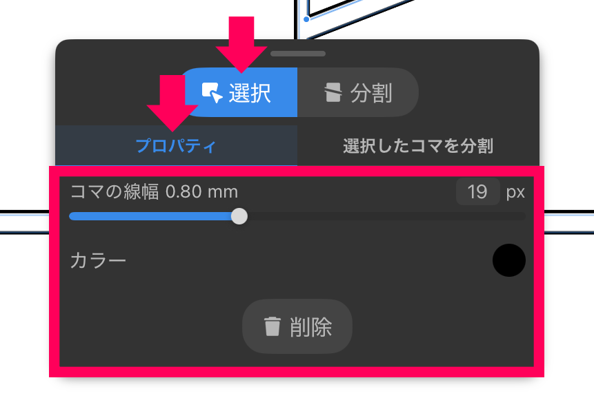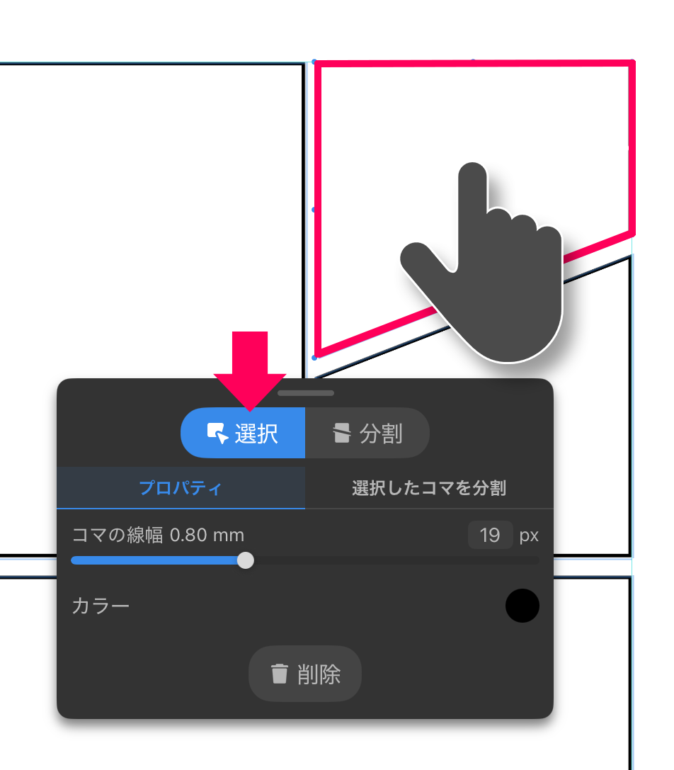 「選択」タブをタップした状態でコマをタップするとコマの編集ができます。