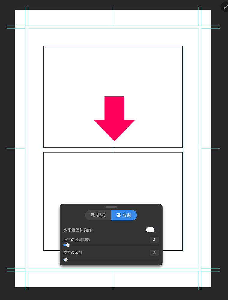 コマの分割前に「分割」タブの「上下の分割間隔」「左右の余白」を設定することで分割時の幅の調整ができます。