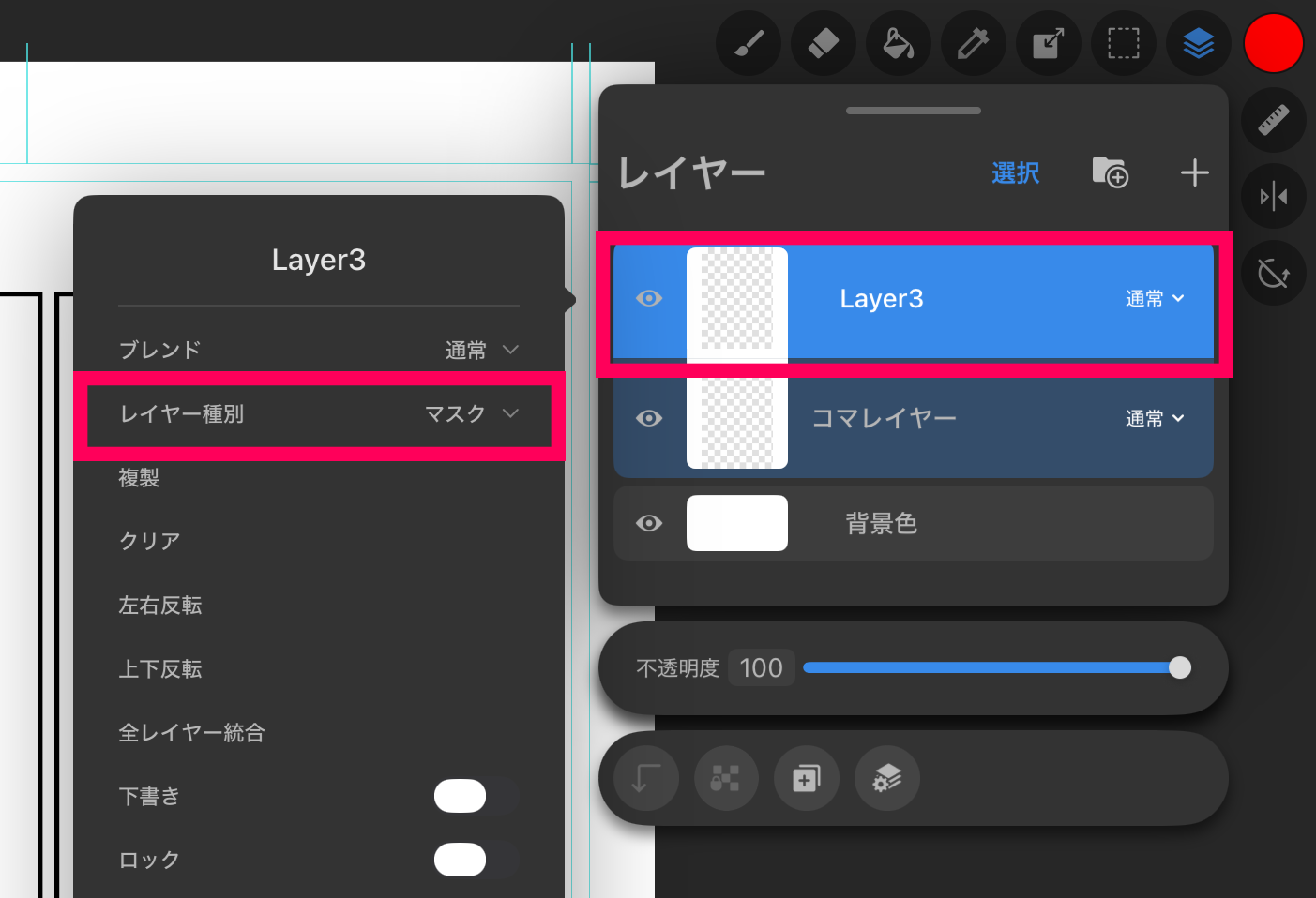 レイヤーウインドウからコマのレイヤーを選択し、