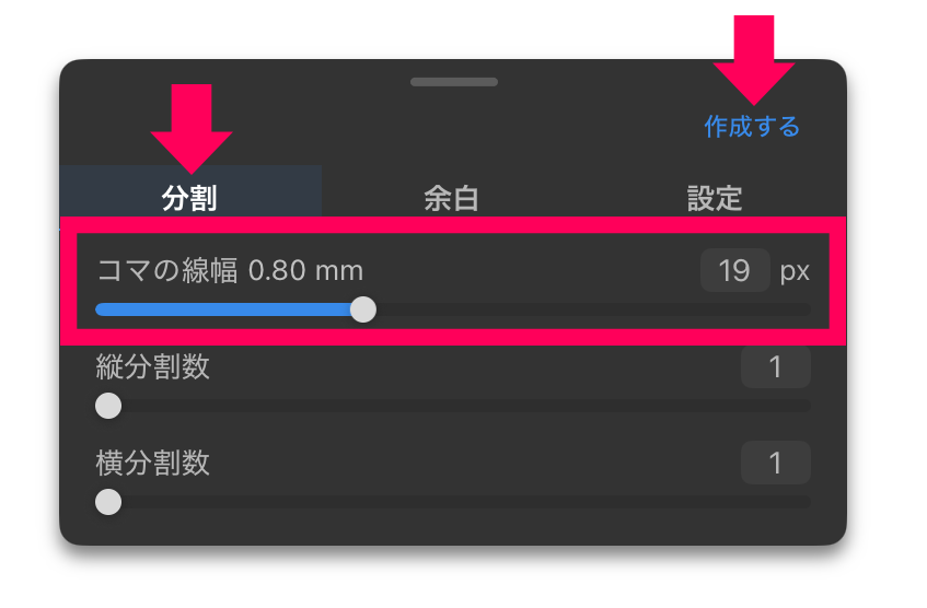 「分割」タブの「コマの線幅」を入力し、「作成する」をタップします。