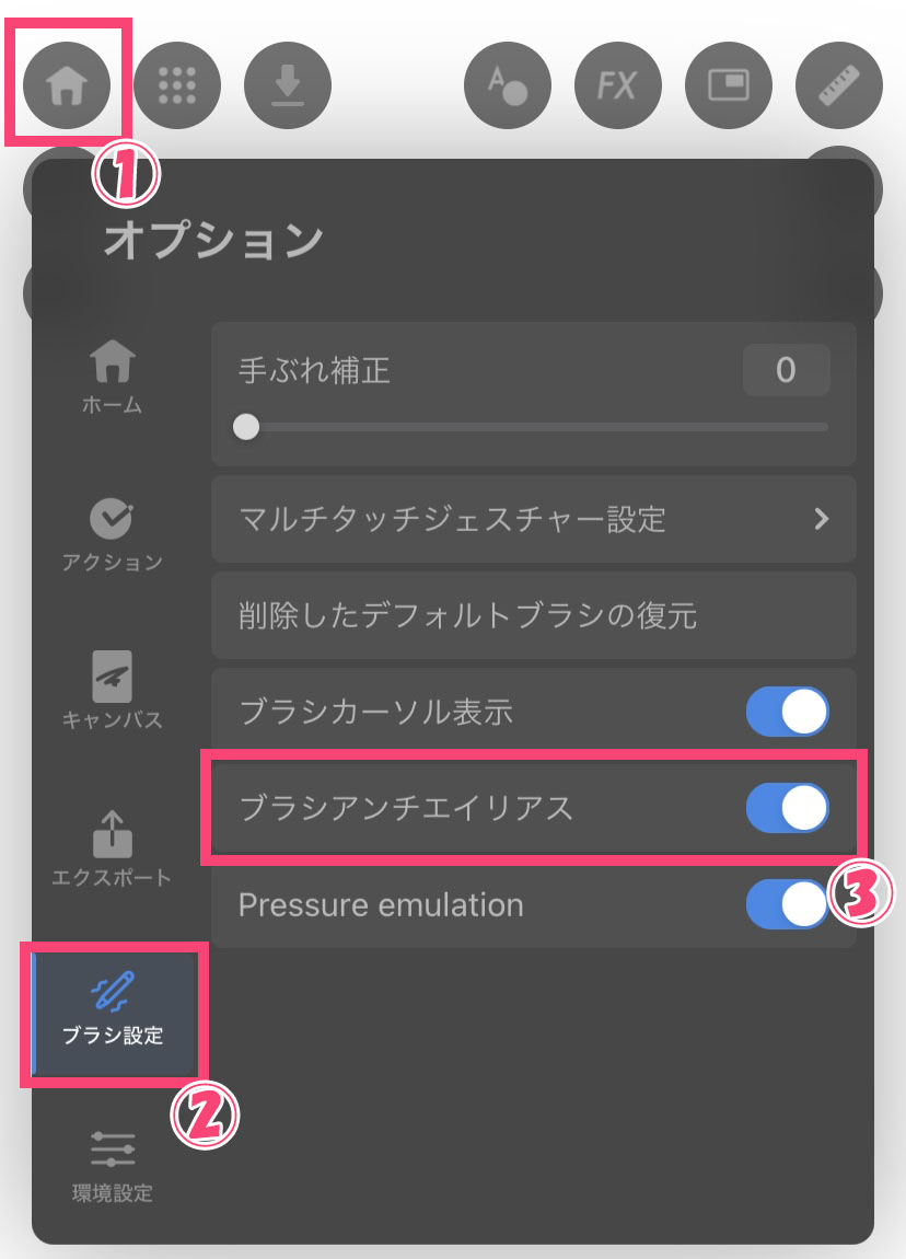 ③「ブラシアンチエイリアス」のON/OFFをボタンで切り替えます。
