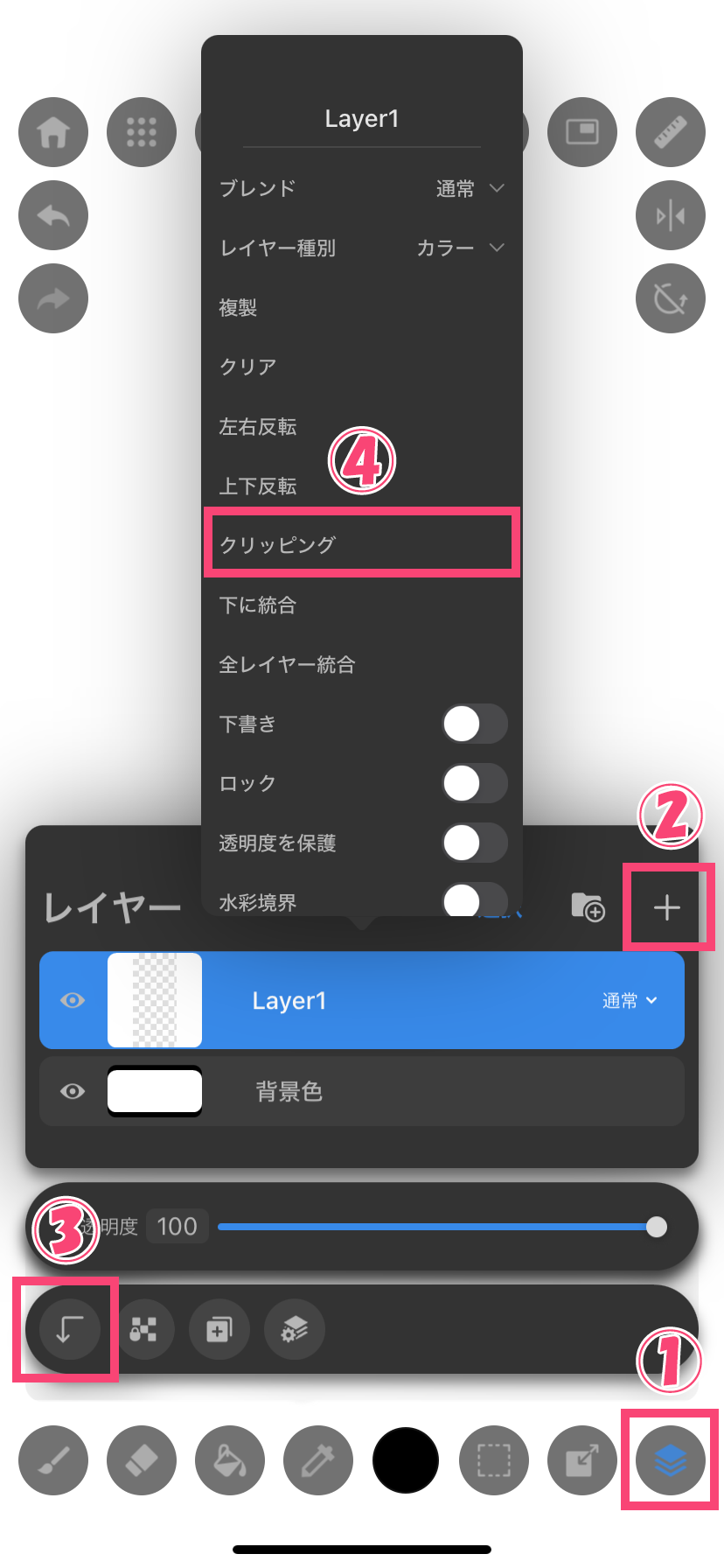 ①レイヤーアイコン…タップしてレイヤーパネルを開閉します。