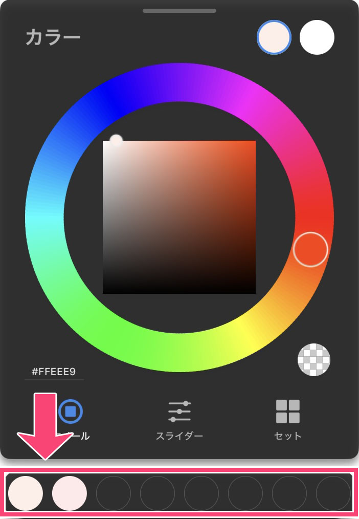 ウィンドウの下には「色の履歴」が新しい順に8つまで表示されるので、「さっきの肌色の方が良かったかな?」という時もワンタップで戻れて便利ですよ。