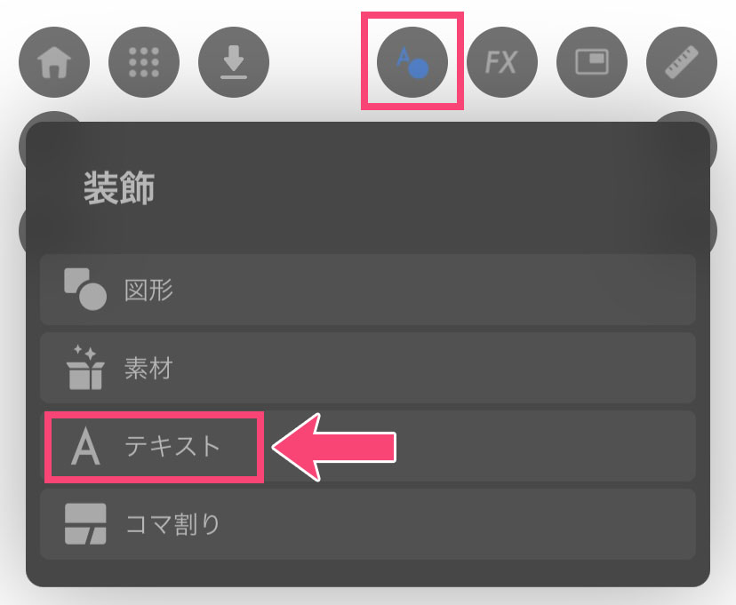 テキストツールは装飾アイコンをタップし、テキストを選ぶと文字の入力ができます。