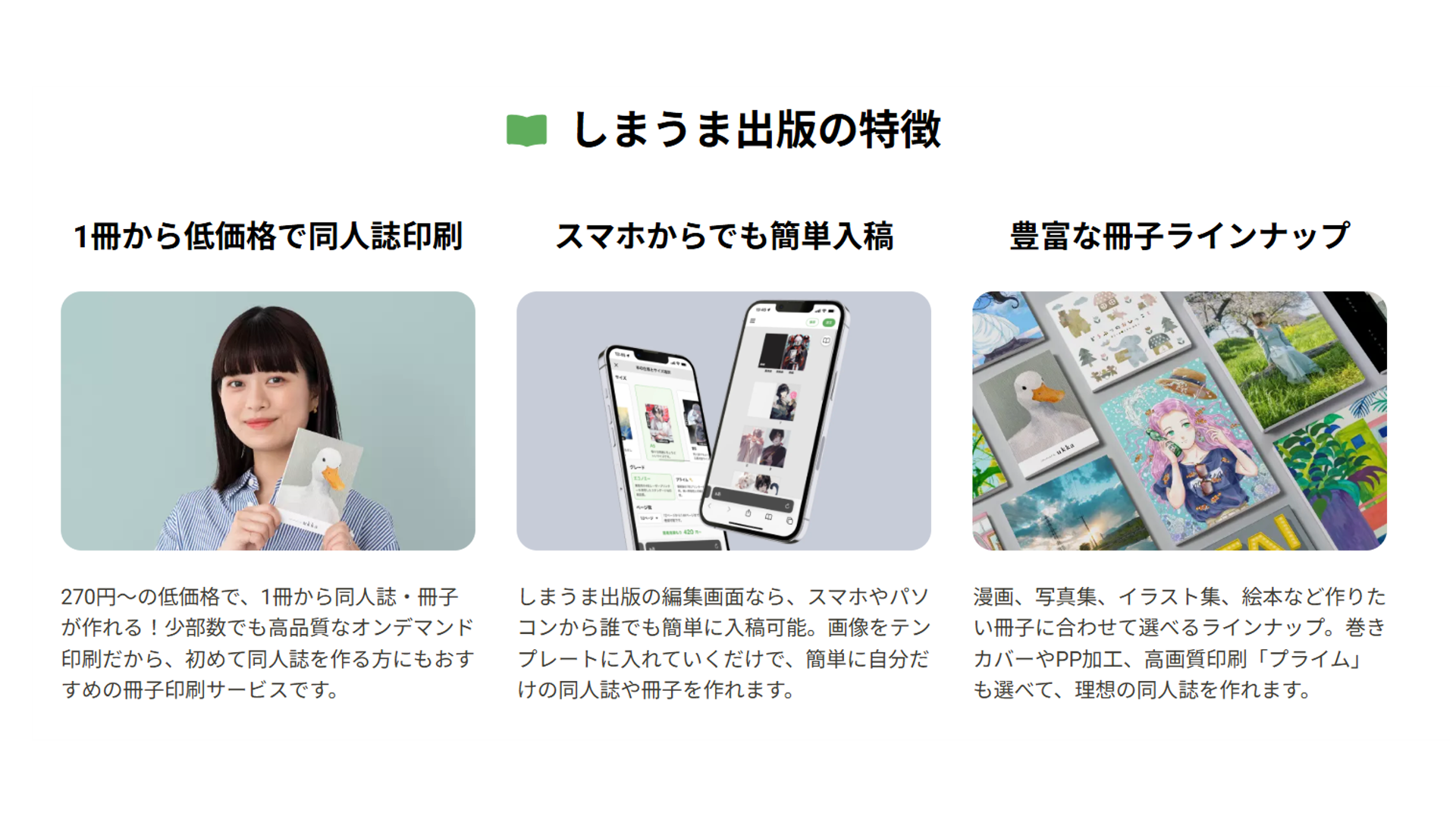 しまうま出版は、株式会社しまうまプリントが提供している、1冊(270円〜)から同人誌や冊子が作れる印刷サービスです。