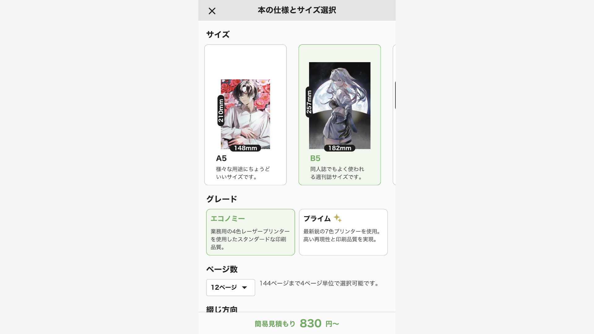 本の種類を選ぶと、本の仕様とサイズ選択の画面になりました。