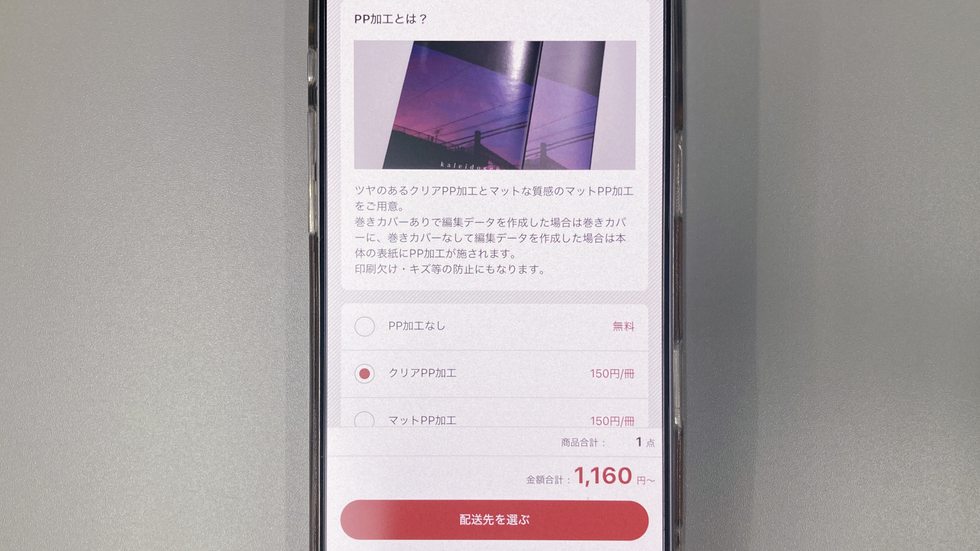 PP加工をつけて1冊1000円程。今回はいろんなオプションをつけたのと、1冊の値段なので割高になりますが、初めて作る時のお試しや自分用に作る時に1冊から注文できるのはありがたいです!