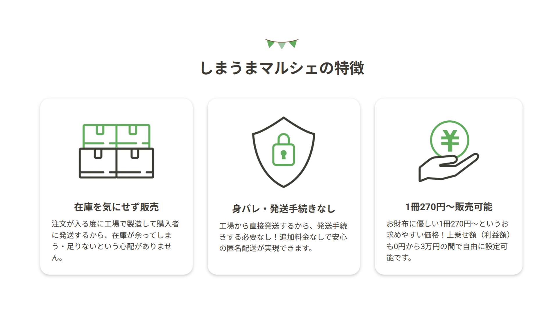 商品登録の審査通過後に販売がスタートし、注文が入ると自動的に印刷から梱包・発送まで、すべてしまうまマルシェ側で対応してもらえます。