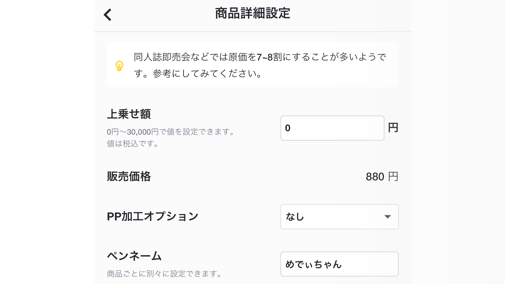 タイトル、販売価格(=原価+上乗せ額)、PP加工、ペンネームの設定のみ。